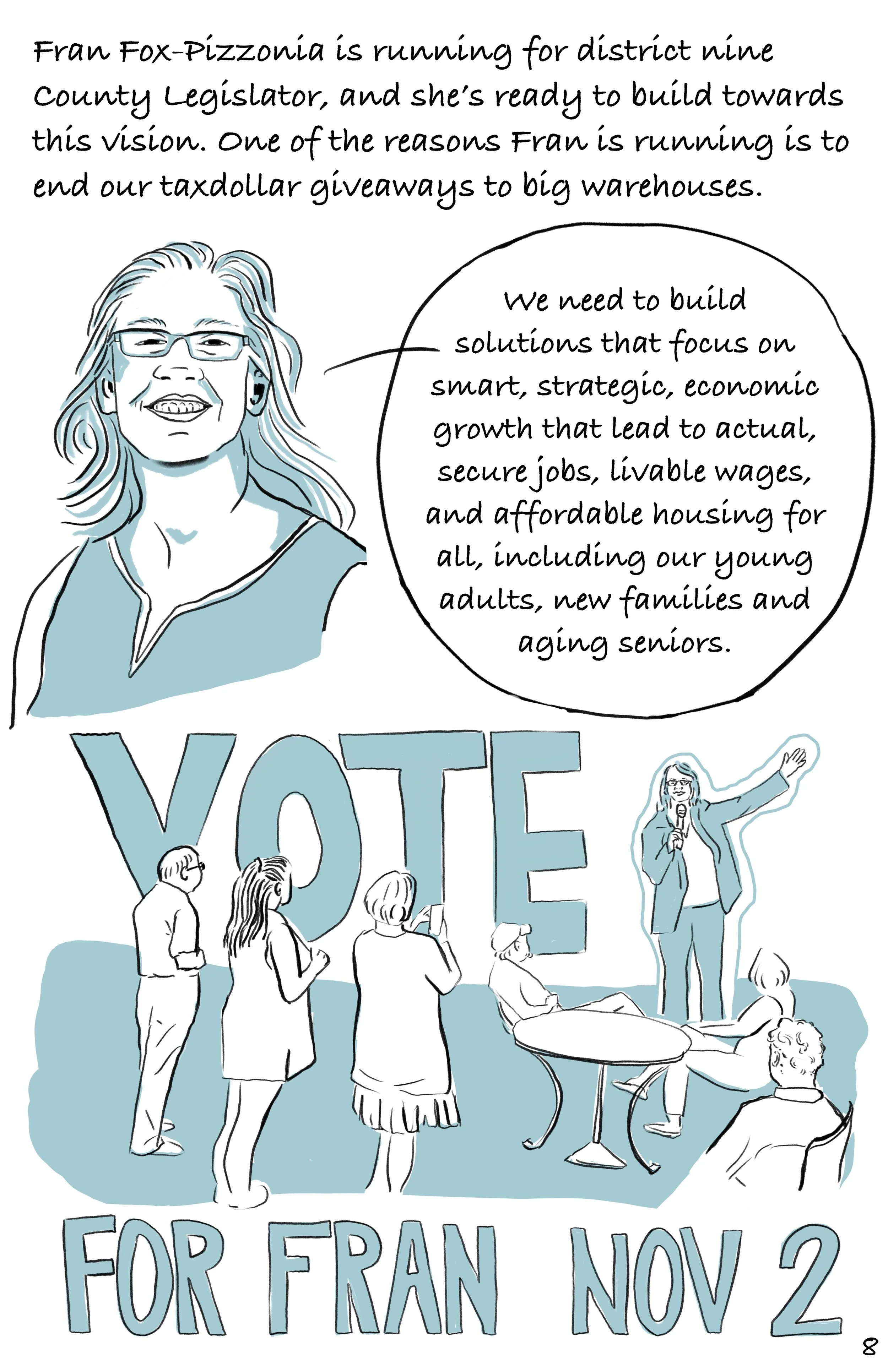 I partnered with Fran Fox-Pizzonia’s campaign for New York District Nine County Legislature to create this zine about the relationship between warehouse developments in the Village of Montgomery, NY, and corruption in local government. It uplifts Fran’s campaign as a new, hopeful vision for Montgomery.